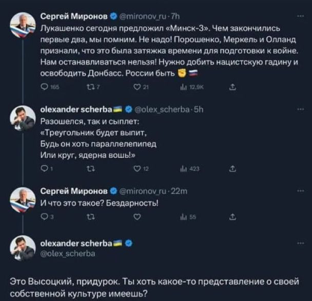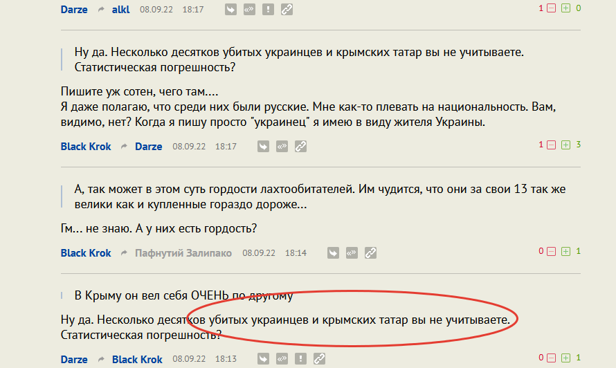 А уж их мужья так и вообще подонки достойные утилизации (уверен она уже успрешно прошла). А уж натягивать сову на глобус приписывая мне слова "когда выгодно то "наши мальчики", а когда невыгодно то "твари"" так это вообще попытка отзеркалировать мои обвинения когда я обвиняю вас в зачатках нацизма (ибо вы начинаете классифицировать людей по признаку... В данном случае от классических нацистов не по национальности, а по паспорту, но сути особо не меняет)...