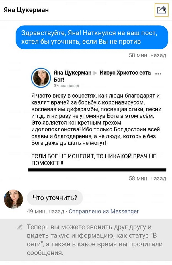 Яна Цукерман создала паблик в FB "Иисус Христос суперзвезда есть Бог", в котором несет обычные слюнявые глупости из серии "Бог есть любовь", "Любовь есть Бог", "Семь бед - один ответ" и "Порядочный христианин не должен пукать в постели". Понятное дело, на эту муть набежало под 30 тысяч подписчиков с ХГМ, а Яна там несет свои благоглупости.