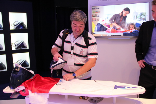 Когда на стендах не хватает длинноногих девушек, иногда просят помочь известных блогеров. Вот один из них наглаживает комбидрез.