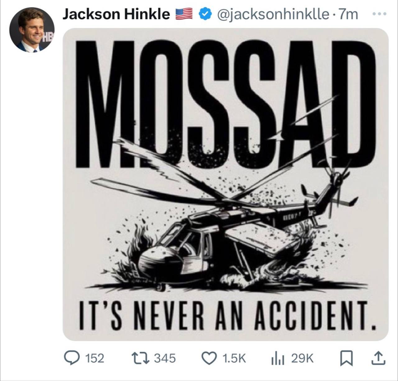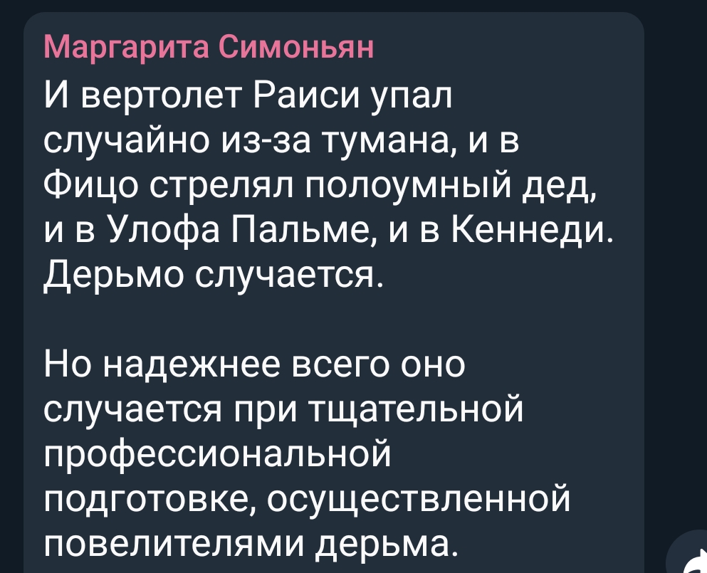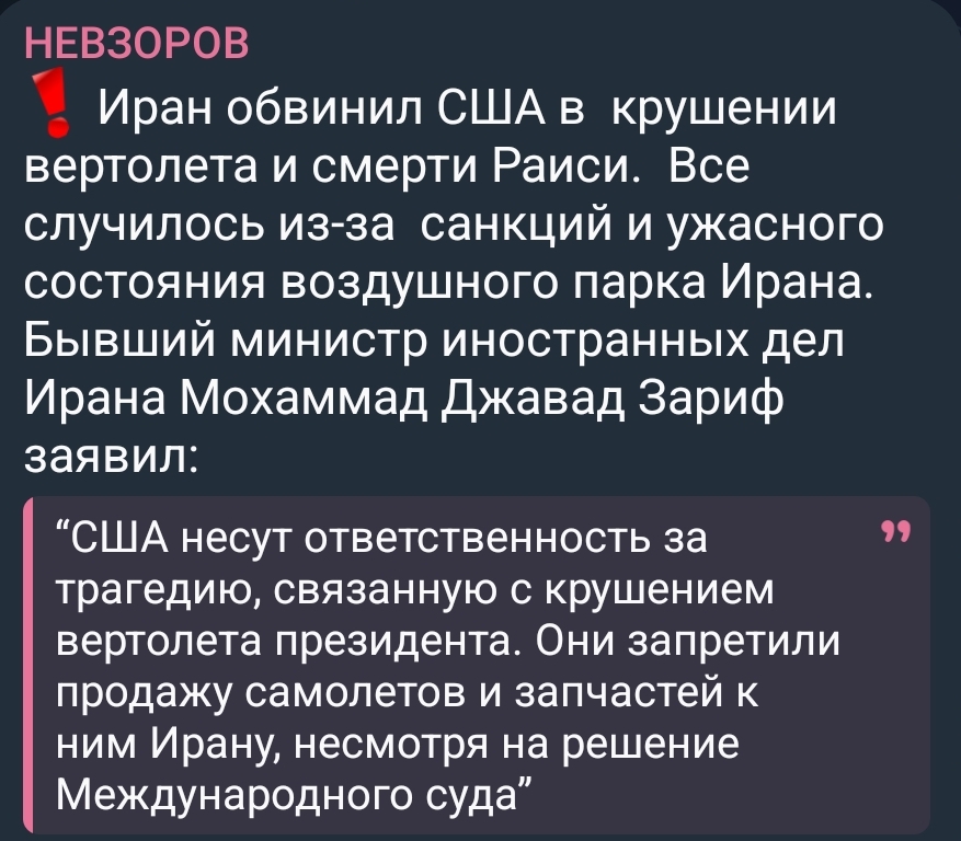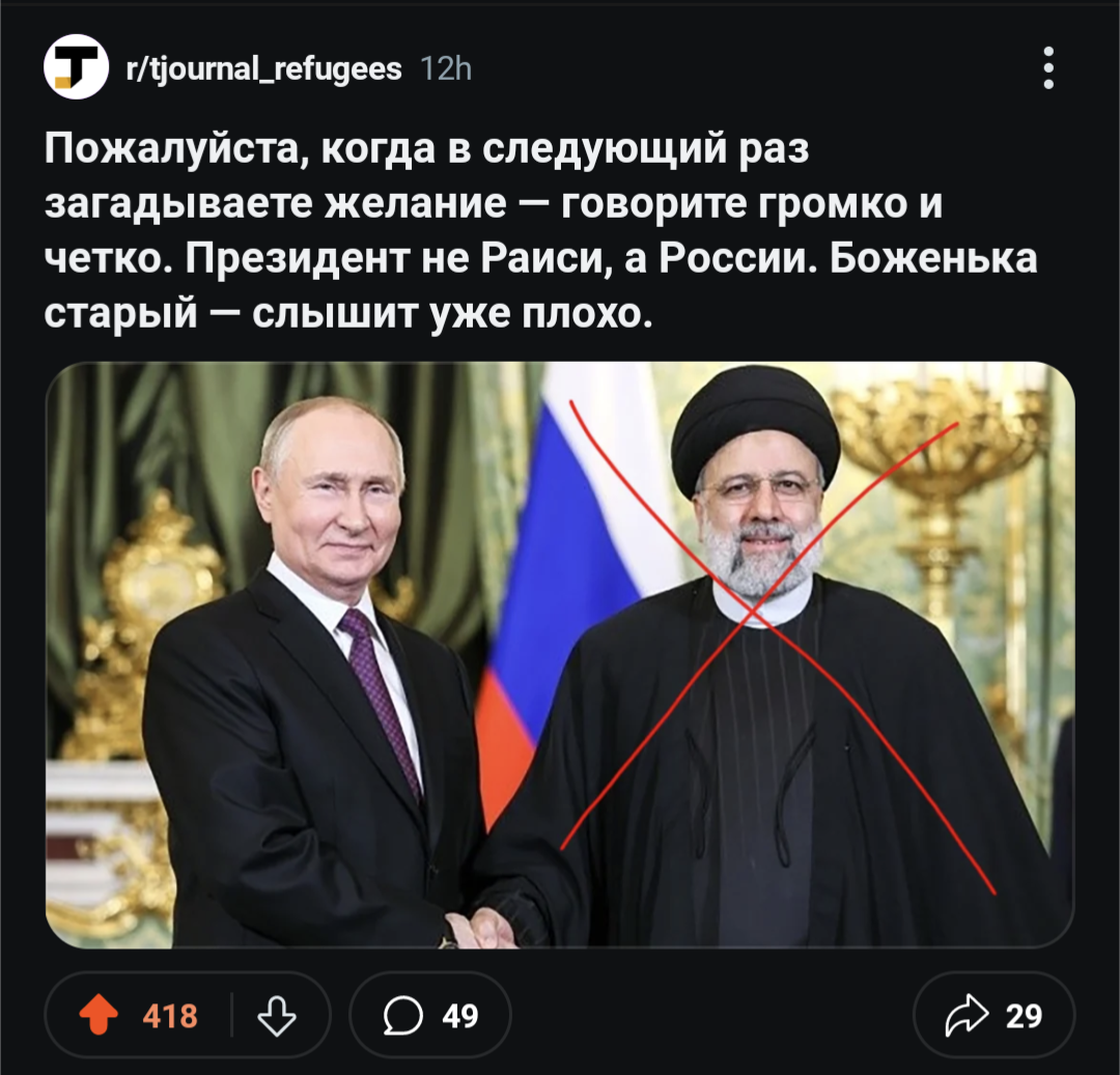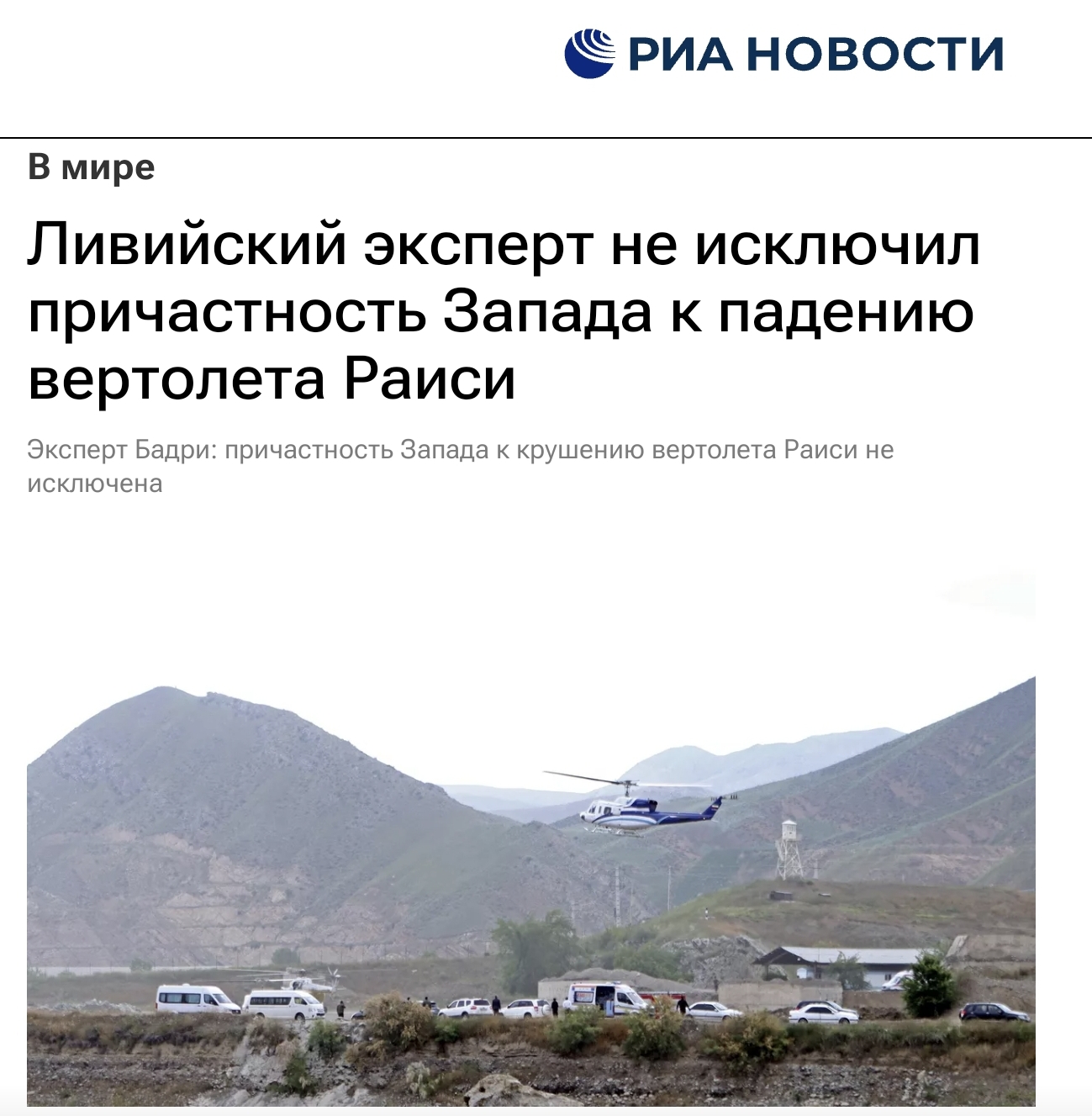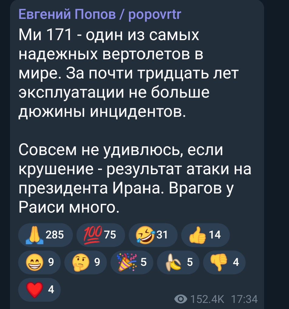 Уже объявили, что президент Ирана Раиси, вертолет которого вчера попал в густой туман на северо-западе Ирана и разбился, погиб. Ну, погиб и погиб - покойный был той еще сволочью, на руках которой кровь тысяч людей. Так что это пускай Путя там свои соболезнования выражает.