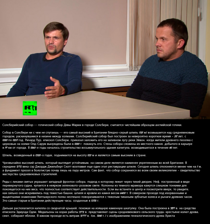 Обычные российские реалии - два предпринимателя - продавцы спортивного питания, с уставной стрижкой и военной выправкой, вдвоем, без семей, полетели в Великобританию посмотреть на всемирно известный собор. Одним днем. У одного из них был флакон женских духов и у обоих, по данным RT - "загранпаспортов у них не было".