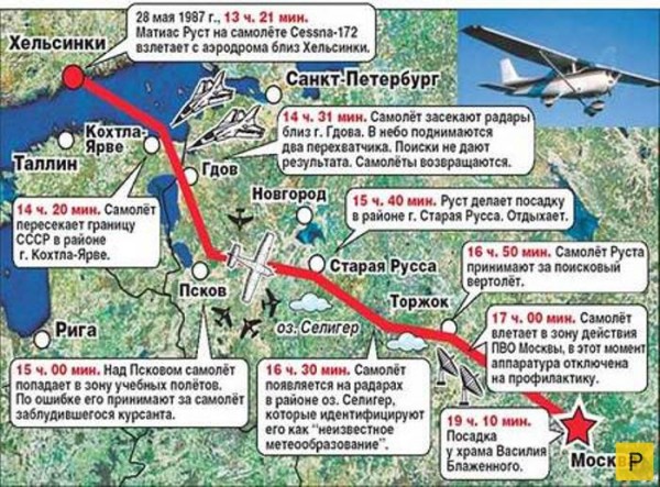 Впрочем, по словам нашего особиста, который через некоторое время проводил среди нас разьяснительную работу - от границы Руста вели радарами. Пво-шники, до майоров включительно, запрашивали разрешение на уничтожение цели. Сратшие офицеры решение не приняли. Летчикам разрешения стрелять не дали... при этом ведущий пары предлагал просто пройти над Сесной на форсаже - тот самолетик просто разметало-бы реактивной струей. Разрешения не дали. В мацковскую зону ПВО те истребители входить не имели права, и они ушли в сторону, а дальше Руст полетел один.
