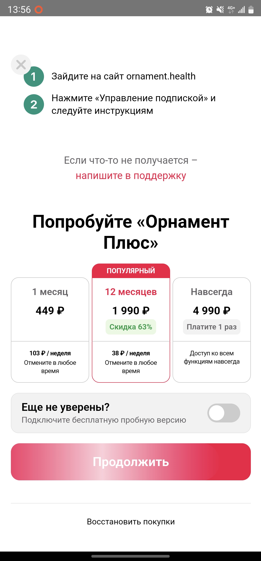 К сожалению со временем с ростом количества данных в базе приложение становится не то чтобы медленным, а мега-тормозным - на каждое нажатие отклик может быть 10-30 секунд и вот это выбешивает значительно больше чем дорогая подписка. Проверено на куче разных телефонов, если выбирать отображение небольшого периода, то работает относительно вменяемо, если же ставить полный период, чтобы видеть всю статистику, то сразу всё тормозит. Сам искал аналоги и как только найду хоть что-то что будет позволять делать примерно то же, что и Ornament, но при этом будет дешевле/не будет так тормозить, то сразу от них уйду. Пока альтернатив я не знаю, но если кто-то подскажет, то буду благодарен, думаю как и Алекс.