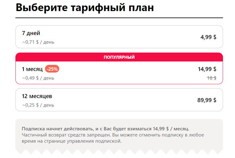 Не увидел где можно заплатить 5000р, в приложении на телефоне он отправляет на сайт при входе на сайт предлагает программы на 7 дней, месяц и год