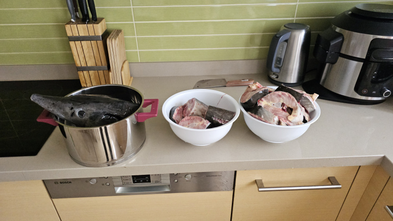 Все, один разделан: голову и плавники - варить, бульон от них - заморозить для супа с морепродуктами, нарезанные из тушки стейки - пару просто в холодильник, сегодня на обед нам с женой, еще четыре - туда же вакуумировать, чтобы подольше пролежали, а остальные в обычные пакеты и в морозилку: если потом размораживать правильно, в холодильнике, то они во вкусе почти ничего не теряют, в отличие от некоторых других рыб, которые после заморозки теряют почти все (как минимум, рыбу-черт морозить смысла нет вообще).