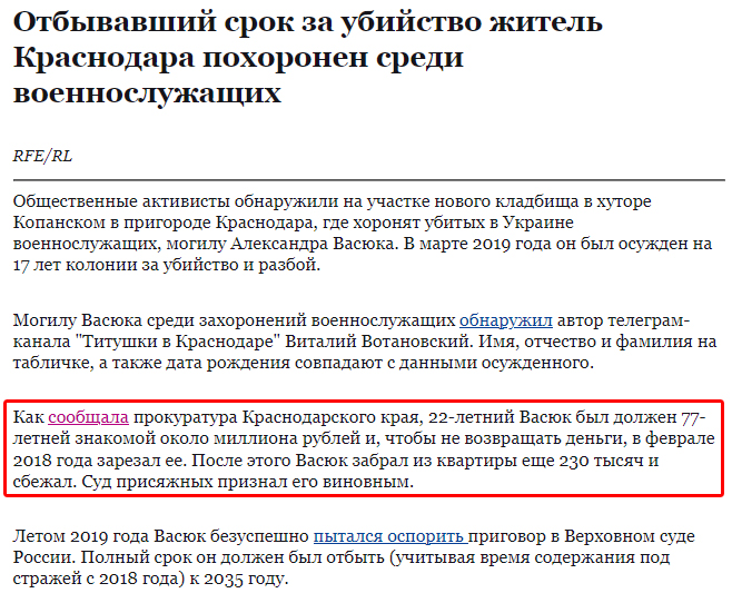 Краснодарский "раскольников" Александр Александрович Васюк в 2018 зарезал старуху-процентщицу должен был выйти из колонии в 2035. Записался в Вагнер и уже вернулся домой. Гойда
