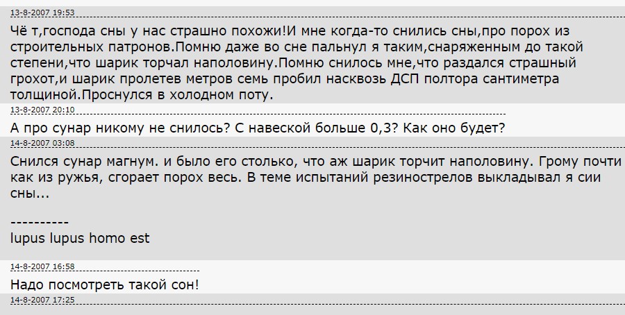 На, например, околооружейных форумах традиционно пересказы снов встречаются. Про пружины там неоригинальные или разгон собак чем-то громким - пусть на безлюдном пустыре, но в пределах города.