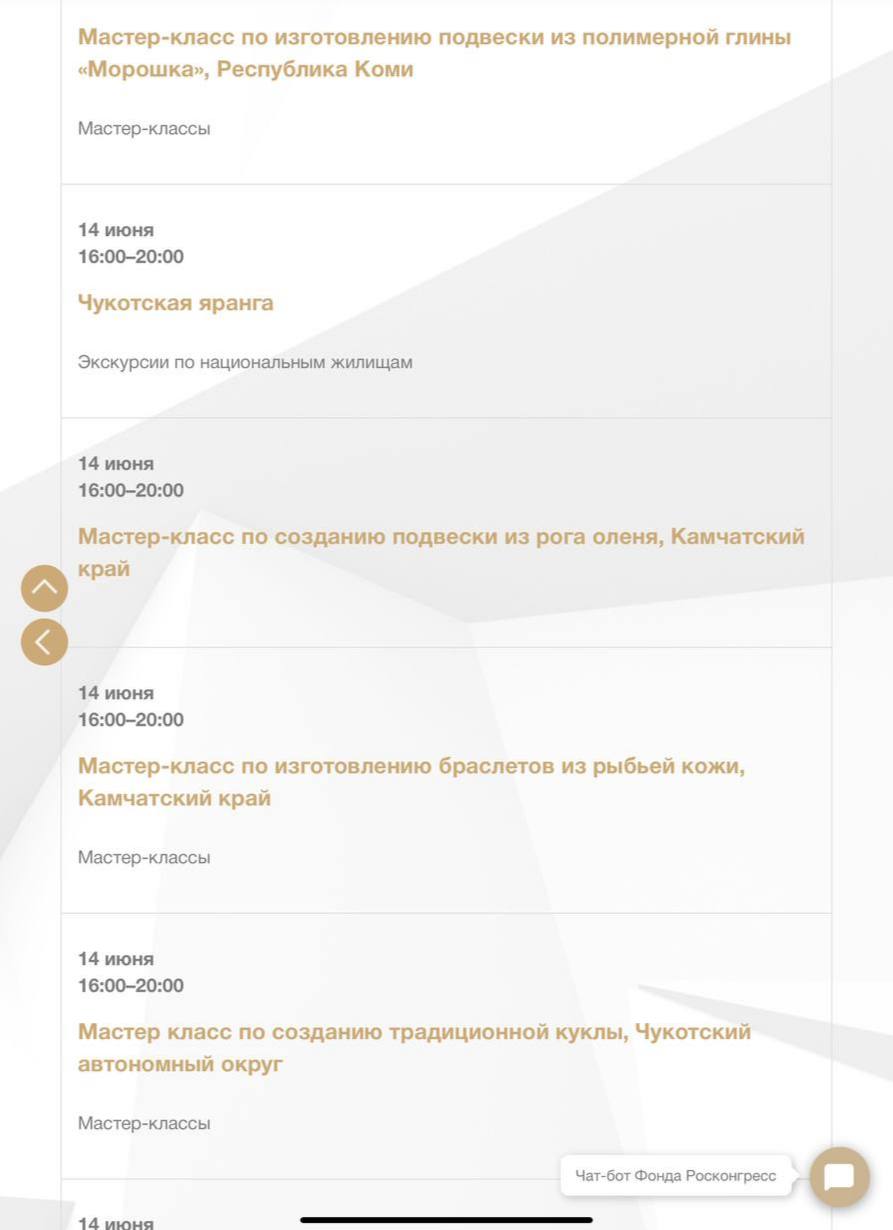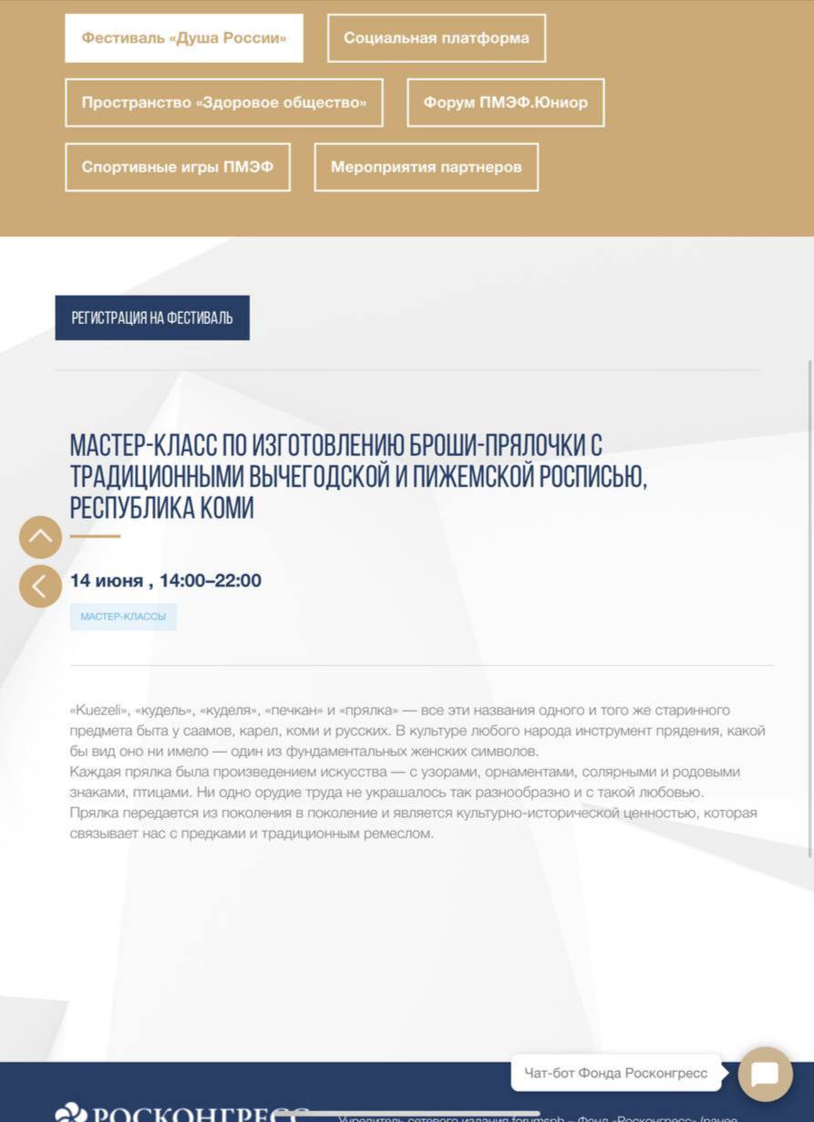 Эти мастер-классы пока в параллельной программе «Душа России». Традиционно она придумана для лиц сопровождающих красные бейджи, и в нашем обществе подразумевается, что это жены (а не мужья). Но, помнится, раньше им были уготованы развлечения без рыбьей кожи, а что-то более лакшери. Типа «обустраиваем дачи в Тоскане и в Карелии» или «учимся отличать уральские изумруды от зимбабвийских».