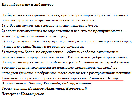 Нет, что меня включили в "либерастов с первой степенью поражения" - это еще вполне нормально. Даже сочту за комплимент. Эти ребята все равно своими мозгами думать не умеют, а пользуются наборами примитивнейших паттернов, которые им вдалбливают из зомбоящика всякие бесноватые кургиняны-леонтьевы. Так что неудивительно. Но что законченную проститутку и великого "державника" Вована включили туда же - это прям какой-то срыв стереотипа. Вове, наверное, должно быть очень обидно. Он ведь так старается, а его в эту компанию. Да еще и рядом со мной - негодяем, который посмел плохо сказать о вовином "евангелии".