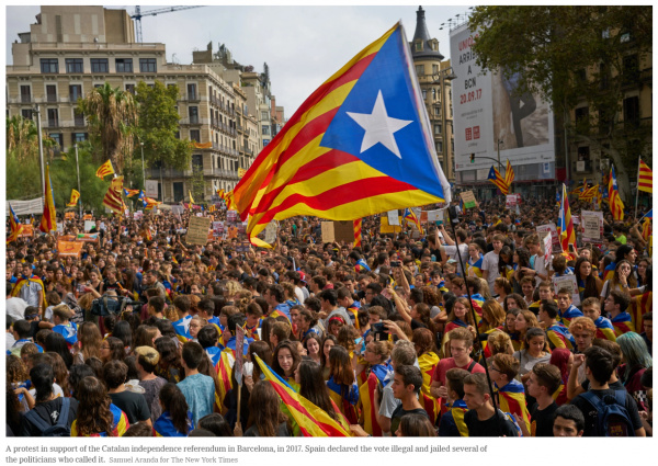 В издании The New York Times большая статья - "Married Kremlin Spies, a Shadowy Mission to Moscow and Unrest in Catalonia" с анонсом, перевожу: "Из документов разведки следует, что помощник одного из ведущих каталонских сепаратистов обратился за помощью к России в борьбе за разрыв с Испанией. Вскоре после этого возникла новая ожесточенная группа протеста".