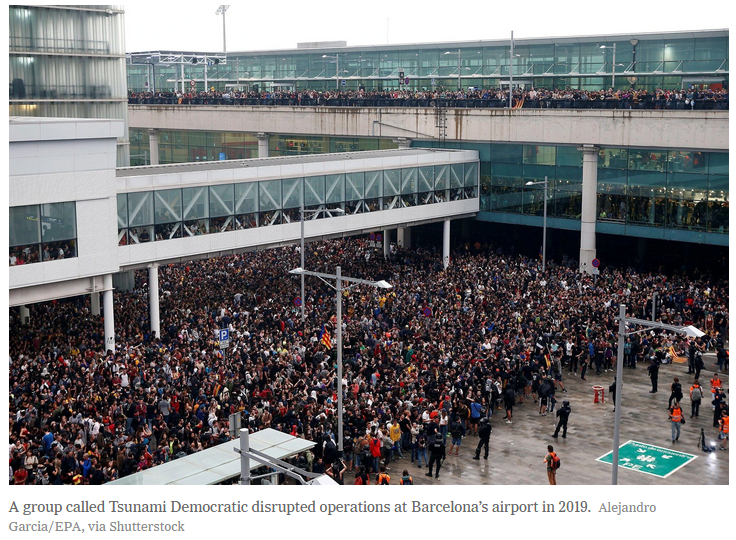 Группа, назвавшая себя «Демократическое цунами», заняла офисы одного из крупнейших банков Испании, закрыла на два дня главную автомагистраль между Францией и Испанией и организовала захват аэропорта Барселоны, в результате чего было отменено более сотни рейсов.