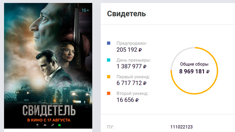 Пропагандистская заказуха под названием "Свидетель" (бывший "Музыкант") продолжает свое победное шествие по экранам РФ. Уже под 9 миллионов собрала, так что прогнозы о том, что общие сборы приблизятся к 13 миллионам, похоже, реальны.