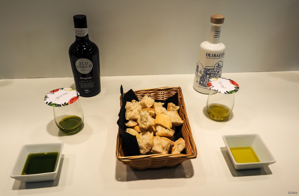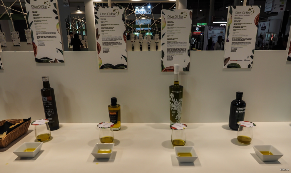 Представлены самые разнообразные дорогие (и дорогущие) оливковые масла. У стаканчика снимаете крышку, нюхаете. Если запах нравится, берете маленький кусочек хлеба, окунаете в плошку и пробуете.