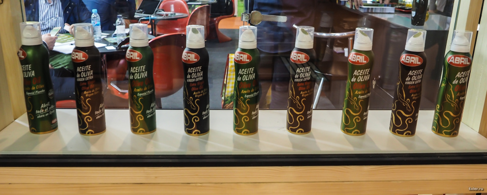 Ниже - тоже классная штука: различные оливковые масла в виде аэрозолей. Очень удобно использовать, например, для того, чтобы обрызгивать порезанные овощи или салат из овощей.
