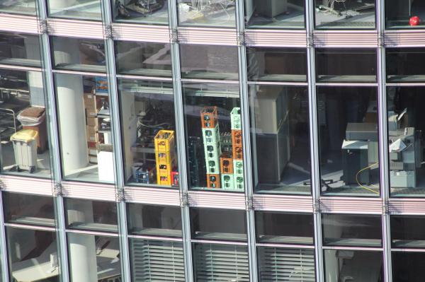 В большом офисе напротив мужики явно не дураки выпить пивка. (Знающие люди говорят, что ящики - из-под кока-колы и прочей дряни, но мне все-таки хотелось бы думать, что это пиво.)