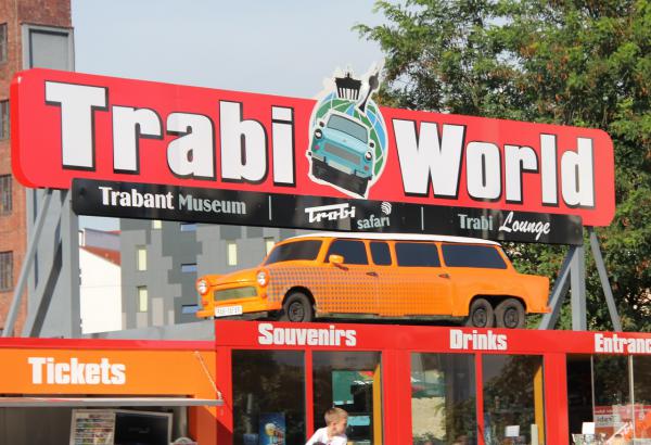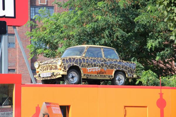 Памятник знаменитому гедеэровскому "Трабанту". Машина приводилась в движение мускульной силой ног, которыми надо было попеременно нажимать на сцепление и газ.