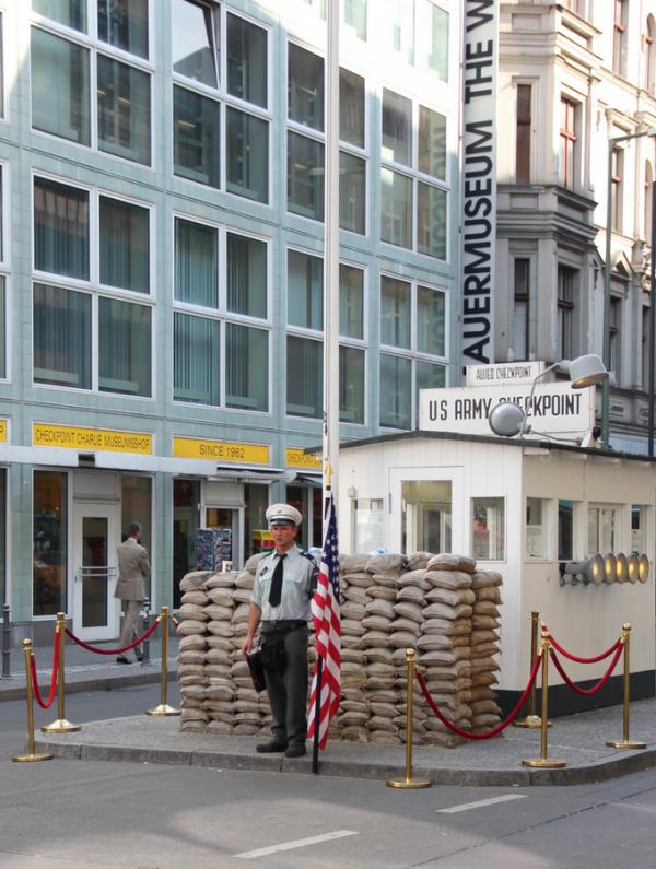 Вот тут было КПП перед американской зоной влияния. Он и сейчас есть. Там даже солдат стоит, охраняет. В туристических целях, конечно. Работка у парня - не позавидуешь. Но зато хоть рабочий день - нормированный.