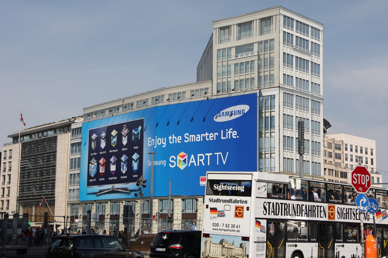 Спустились вниз, полюбовались на Потсдамер-платц, который застроен в духе какого-нибудь Дубая - сплошное стекло и бетон. Правда, Берлин - город бедный (это вам не зажравшийся Гамбург), поэтому несколько зданий в левой части площади - чистые Потемкинские деревни. Нет там реальных зданий, только картинки на фасаде - вот, например, дом за плакатом Samsung. Это все нарисовано. А сразу и не скажешь.