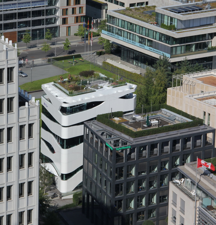 Смотрите какое интересное здание (вот это белое, навороченное). А в садике на крыше я бы хотел побывать - жаль, что времени не было.