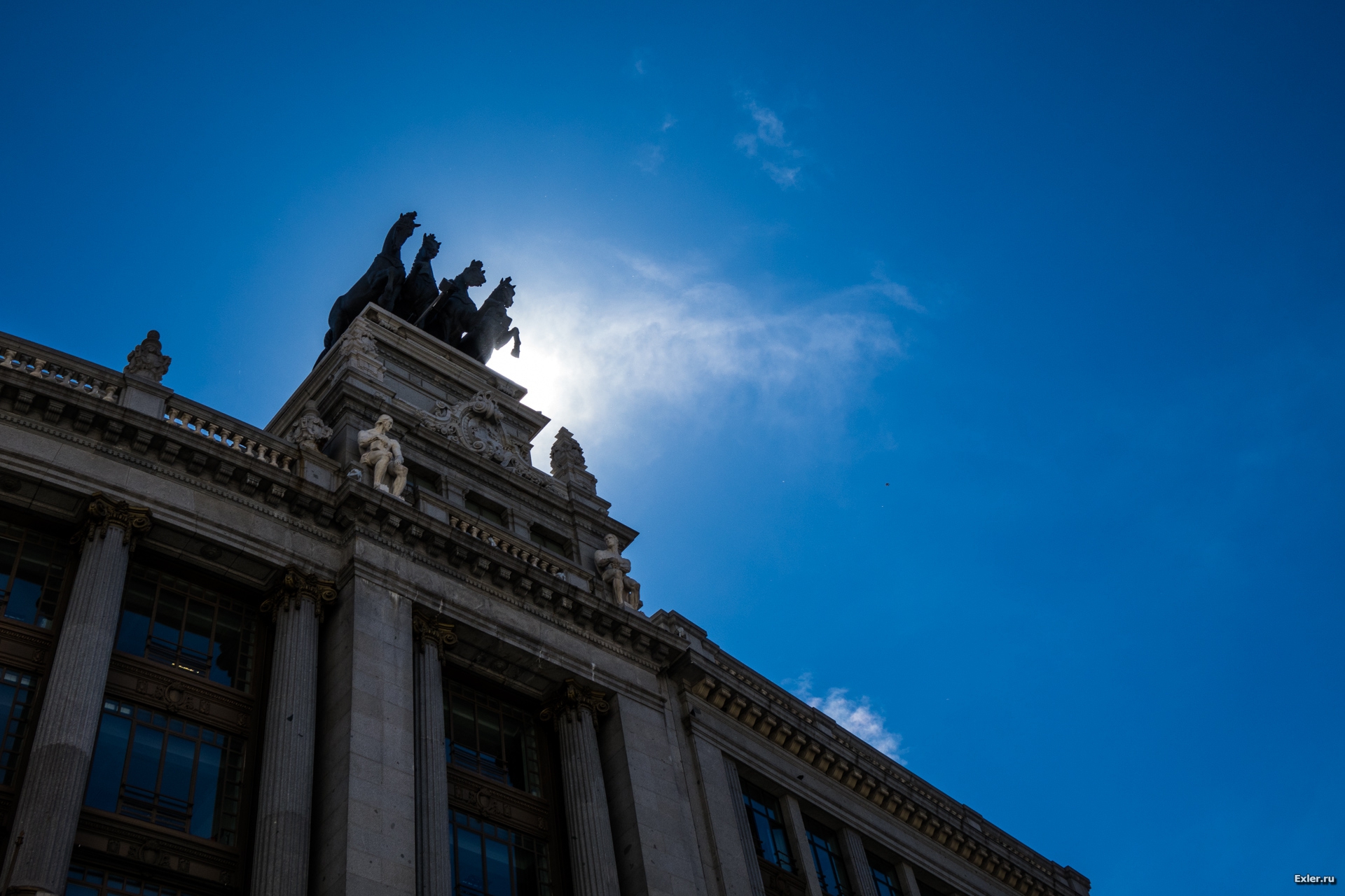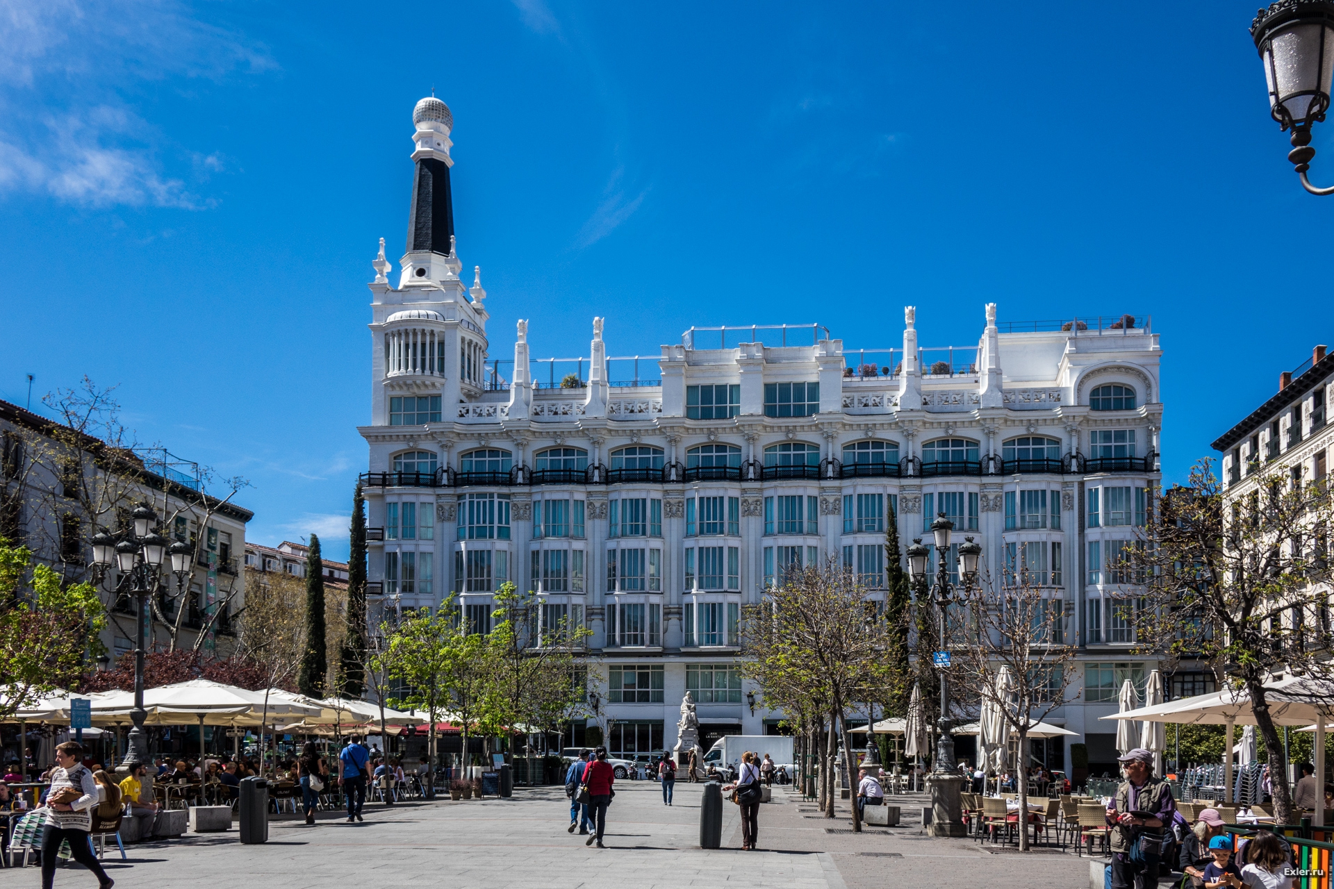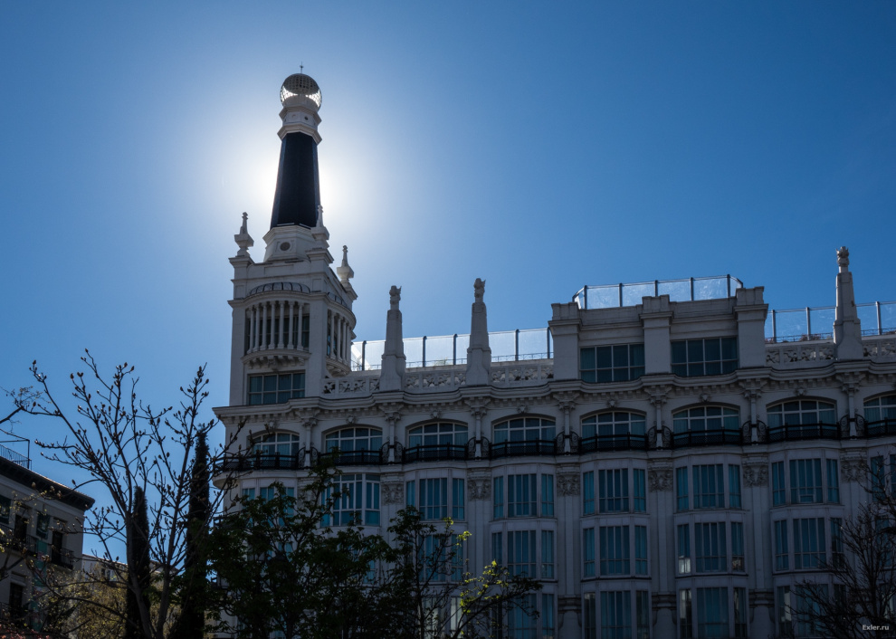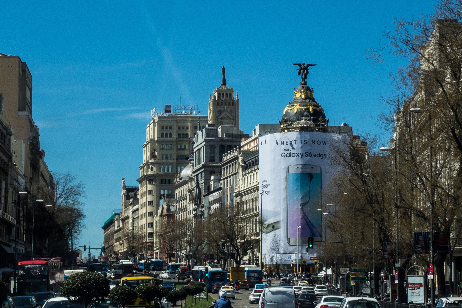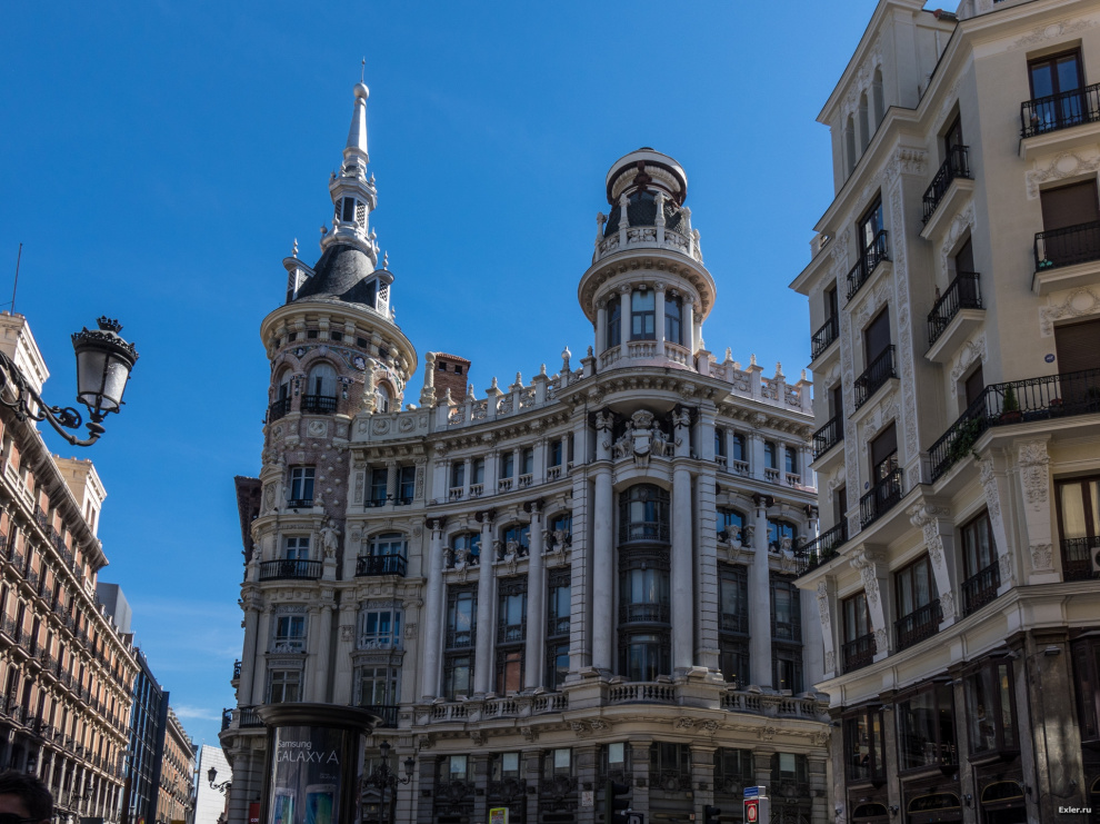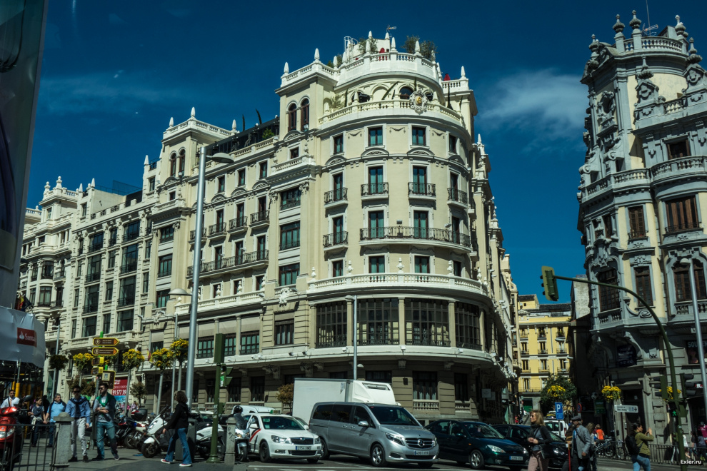 Едем по главной улице Мадрида, которая так и называется - Главная Улица. Вот этот кадр со зданием с интересным куполом справа (вроде бы это какой-то банк) часто показывают, когда хотят продемонстрировать Мадрид. Однако сейчас здание реконструируется, и его закрыли рекламой Самсунга. Уж не спрашивайте, во сколько это "Самсунгу" обошлось.