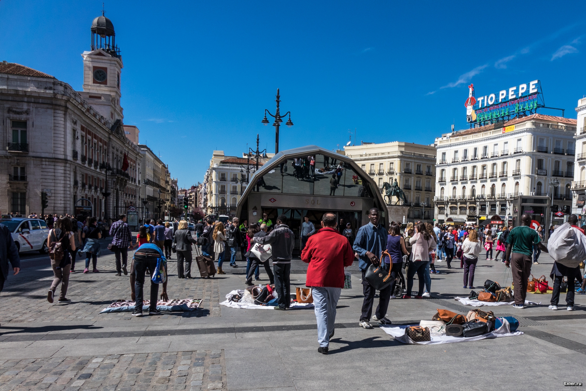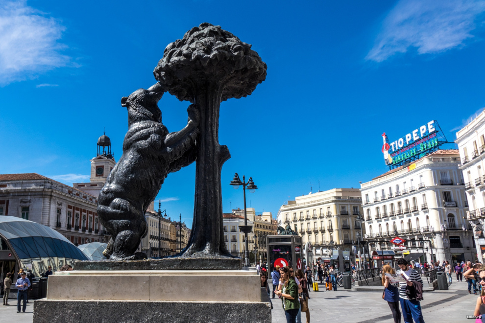 А это уже площадь Ворота Солнца - Puerta del Sol. Правда, ворот там уже давно никаких нет, но осадочек остался, поэтому и название такое. На ней установлена скульптура медведя, которому надо почесать пятуку и загадать желание. Говорят, желание обязательно сбудется, если медведь от щекотки захихикает.