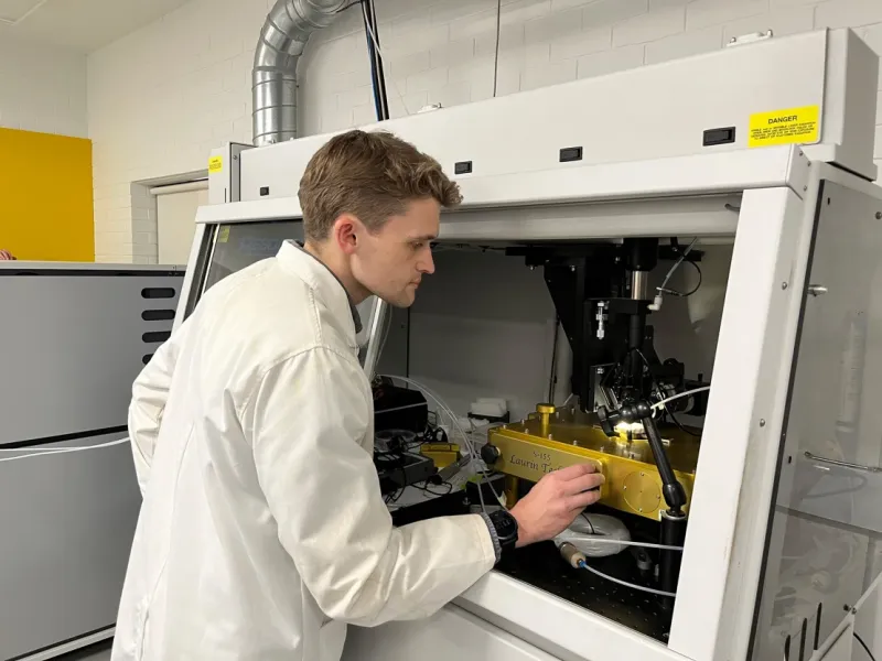 Сотрудник Университета Кертина Энтони Кларк изучает образцы с Алтарного камня в лаборатории (Университет Кертина)