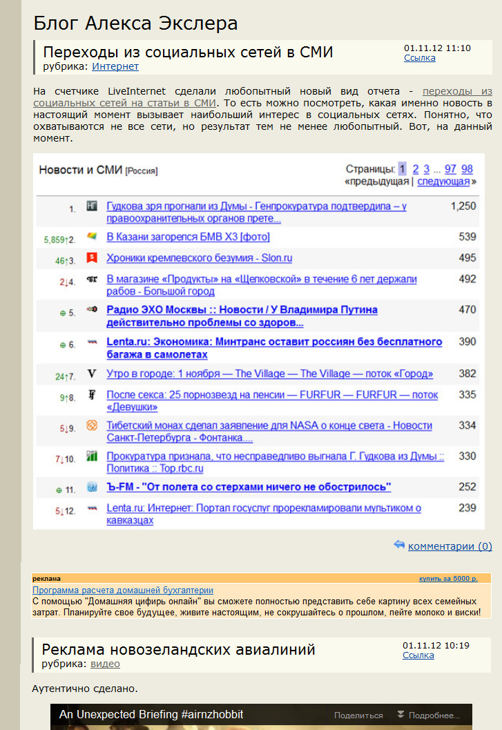 Как и куда предполагается (пока теоретически, для обсуждения) его устанавливать? Под самой последней (свежей) записью в ленте блога. Блок будет виден в ленте и при комментировании записи. При этом, когда появляется новая запись, промо-блок перемещается туда, а в старой записи исчезает. Предполагается, что промо-блок вообще никуда не будет транслироваться - ни в трансляции блога в ЖЖ и другие социальные сети, ни в RSS. То есть он находится исключительно на самом Exler.ru и висит только под конкретным постом. Выглядеть это должно примерно так (кликабельно).