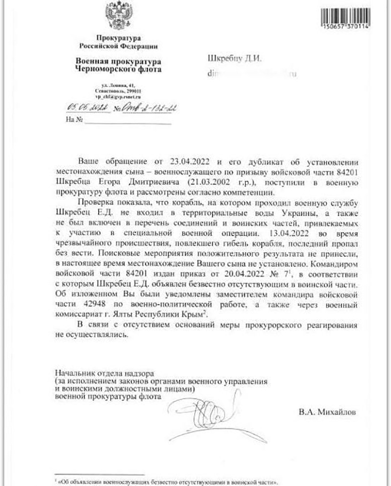 Так как связаться с сыном Дмитрий так и не смог, он написал запрос в военную прокуратуру. Ответ был получен - Via. Оцените уровень скотства ответа.