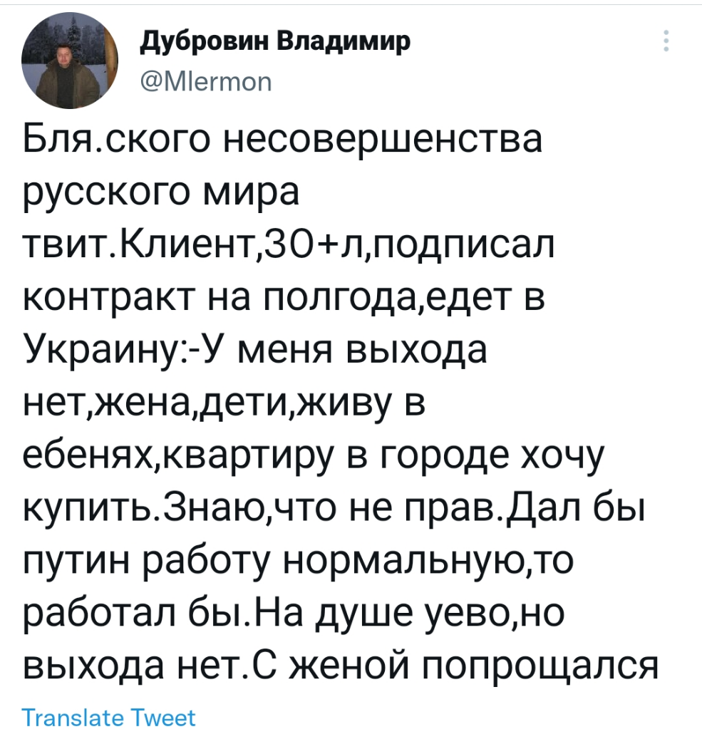 Легко поддерживать войну, когда она тебя не касается. Пока не касалась, поддерживал, как коснулась - перестал. Он же думал, что воевать будет не его сын, а другие. Да ещё и верил, что тупым украм нечем достать корабль.А оно вон как вышло. Кстати ходят слухи, что "тупые укры" отправили на ...й ещё один "русский военный корабль". И всё это при полном отсутствии флота 😄Пожалуй это первая за очень много лет война, где большой кусок флота потерян в боях не против другого флота.