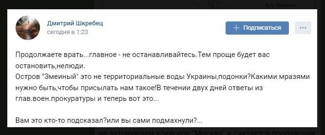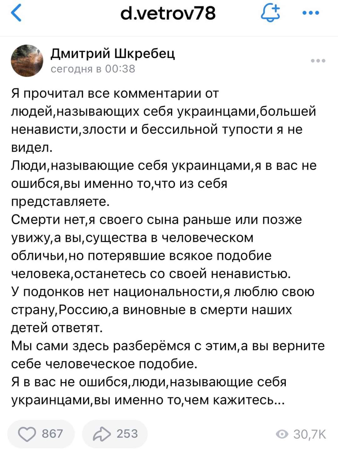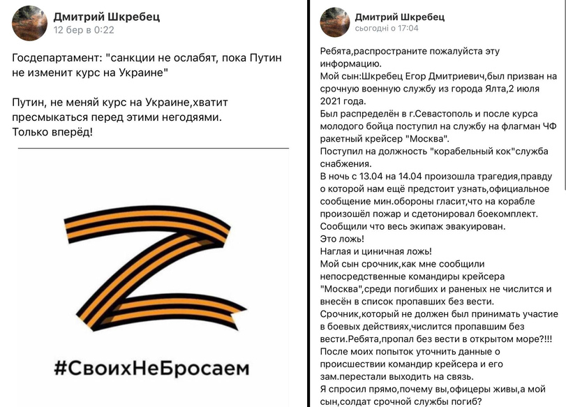 У Дмитрия Шкребца сын служил на крейсере "Москва". Когда крейсер затонул, Дмитрий начал задавать вопросы в телеграм-канале Симоньянши, за что она его немедленно забанила в рамках патриотической операции #своихнебросаем - Via.