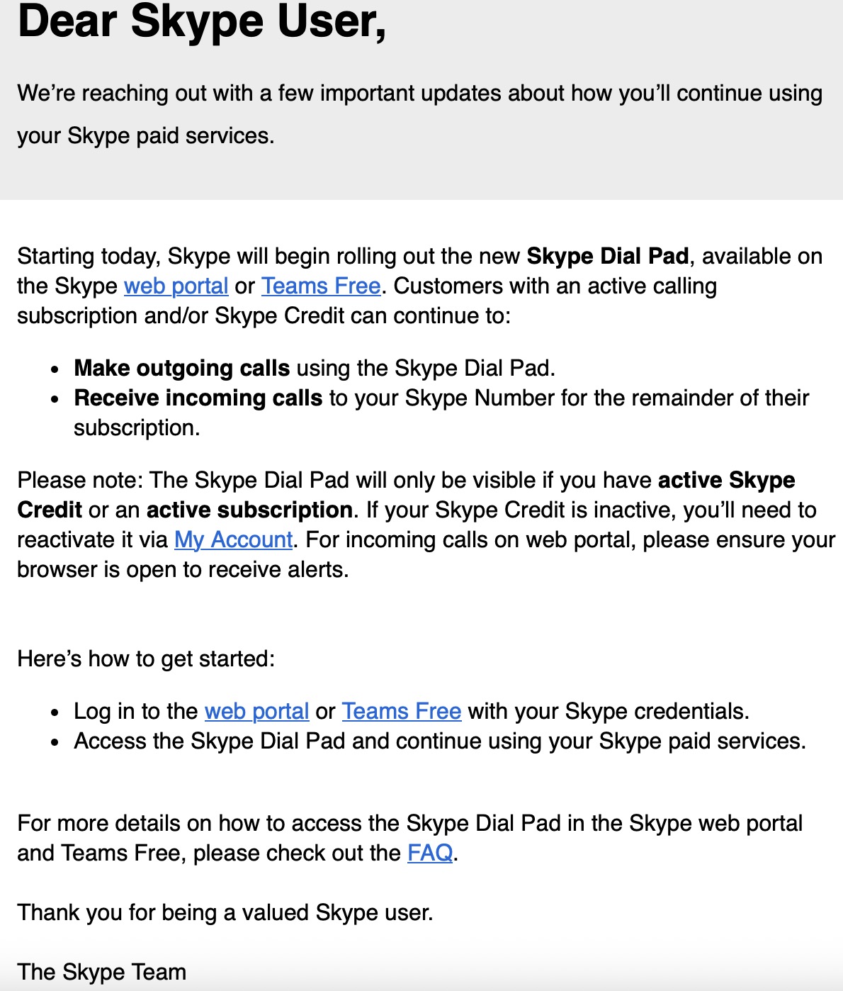 Мне это письмо пришло ещё 7 марта (подписка Microsoft 365 семейный). Вот такого для "Dear Skype User" пока не приходило.
