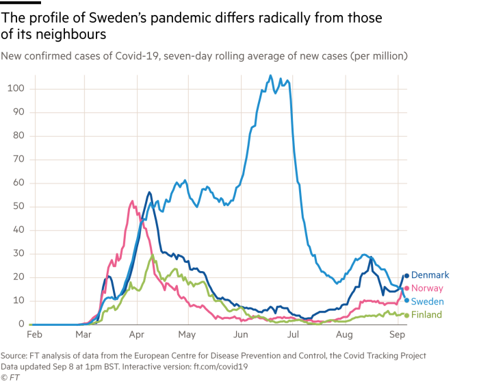 Отличный график, показывающий что в результате отсутствия карантина вторая волна в Швеции вышла на пик в середине июня, впереди Европы всей.