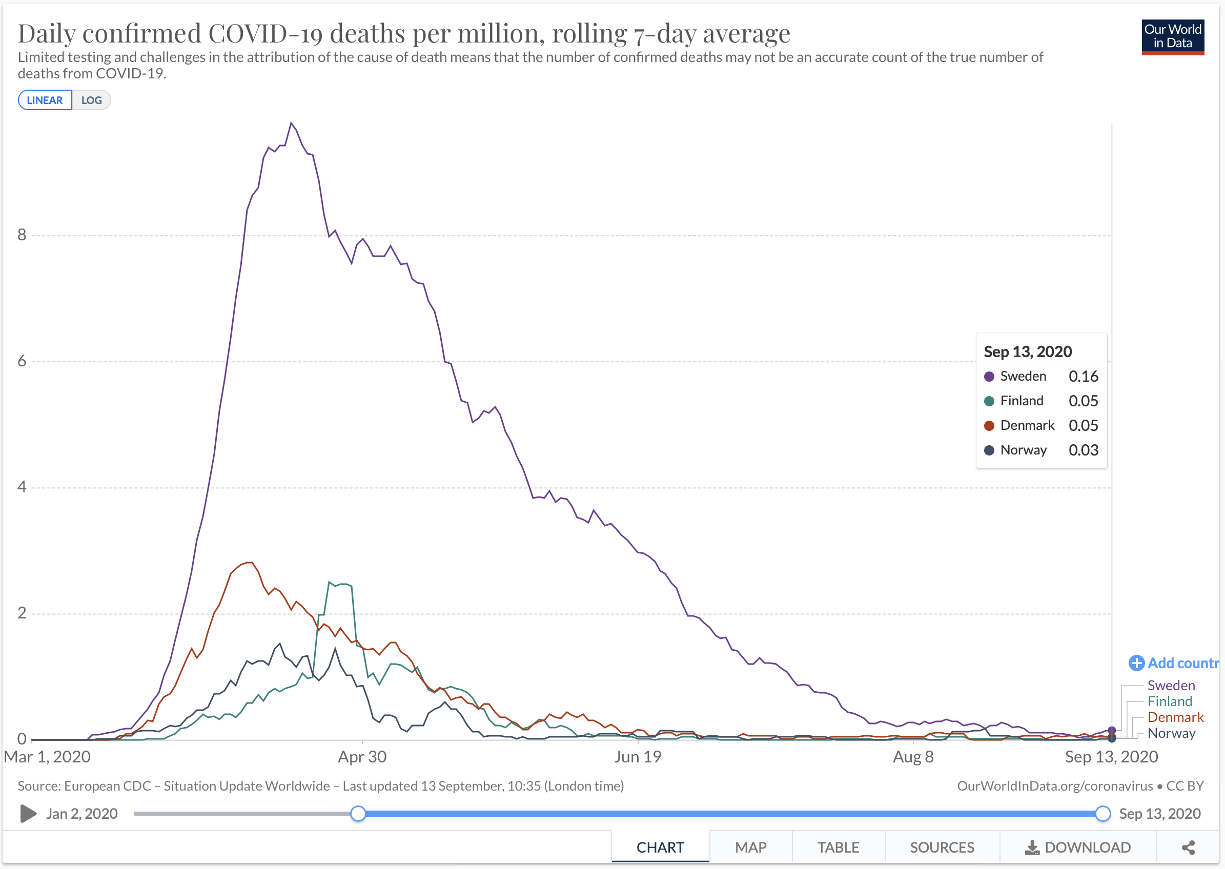 Сегодняшняя линия партии -- шведская смертность средняя по Европе потому что локдаун там _был_, а сравнивать Швецию и Норвегию нельза -- это агитация за швекзит.