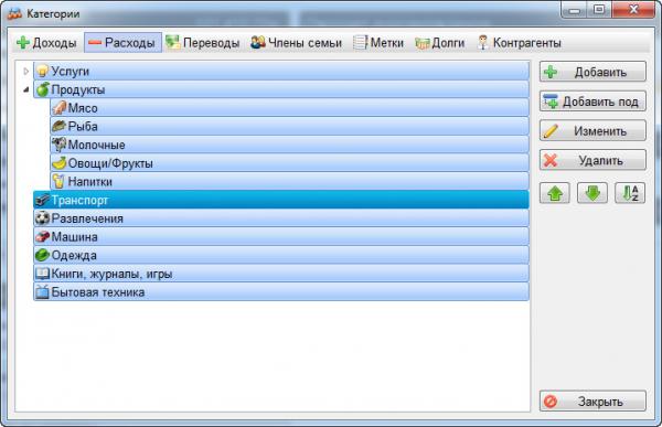 В основе программы лежит идея разделения расходов (и доходов) на категории. Это позволяет сразу, без необходимости изучать отчеты, видеть, куда и в каких количествах тратятся деньги. Система категорий - древовидная с неограниченной вложенностью: каждая категория может иметь подкатегории, те, в свою очередь, свои подкатегории и так далее. Также расходы (доходы) можно делить по членам семьи и присваивать им специальные метки. Таким образом, можно легко оценить все движения денежных средств - от общей картины до мельчайших деталей.