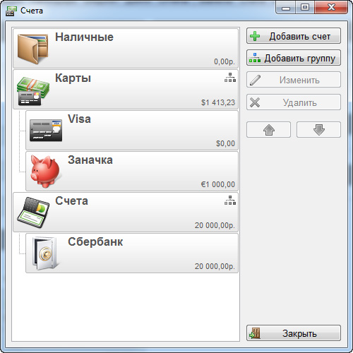 Вы можете создать неограниченное количество счетов, таких как кредитные карты, счета в банке, наличные, электронные деньги и т.п. Для каждого счета можно указать его имя, валюту, начальный баланс, добавить коментарий, присвоить один из 60 симпатичных значков. Более того - вы можете объединять счета в группы.