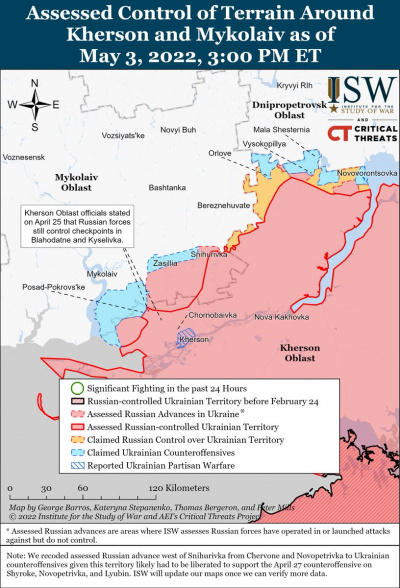 В течение ночи вашингтонский Институт изучения войны (авторитетный исследовательский центр, детально анализирующий ход конфликта) в своем "Твиттере" обратил внимание на то, что Россия начала рассказывать о применении противокорабельных ракет "Оникс", причем по наземным целям, для которых они не предназначены. Обе стороны сообщали, например, что такими ракетами 30 апреля был обстрелян аэропорт Одессы. Аналитики института полагают, что это может говорить о том, что в России образовался дефицит других типов высокоточных ракет дальнего радиуса действия.