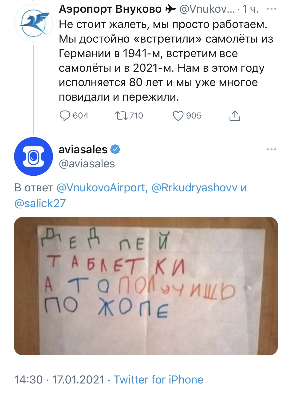 "Ребятки! Вы немецкие самолеты, дорогой аэропорт Внуково, принимали в 39-ом, когда к вашему другу Сталину приезжал гитлеровский министр иностранных дел Риббентроп! Не забывайте эту позорную страничку в своей истории, дорогой аэропорт Внуково... )"