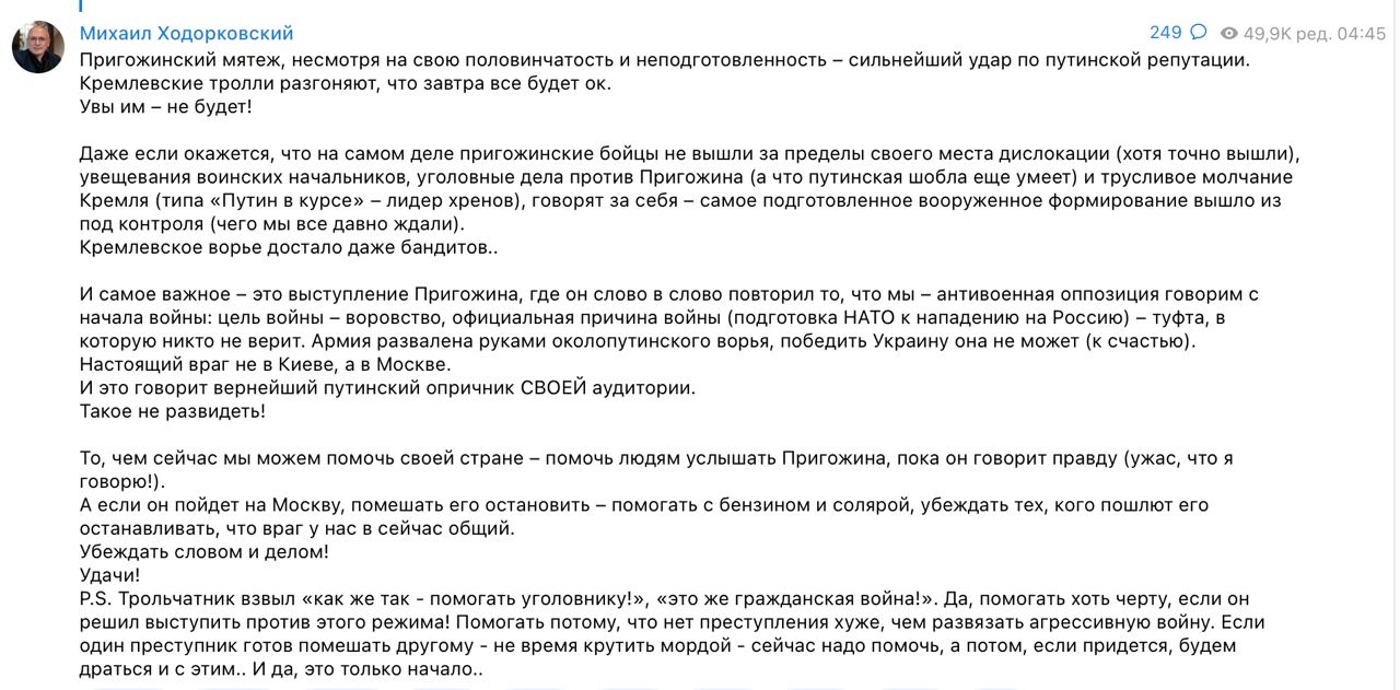"Вагнер, берите власть в свои руки. Нам с вами будет проще договориться, чем с шайкой неонацистов и наркоманов, которые засели в Кремле и взяли в заложники целый российский народ!"