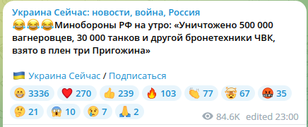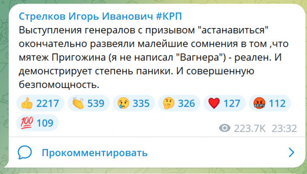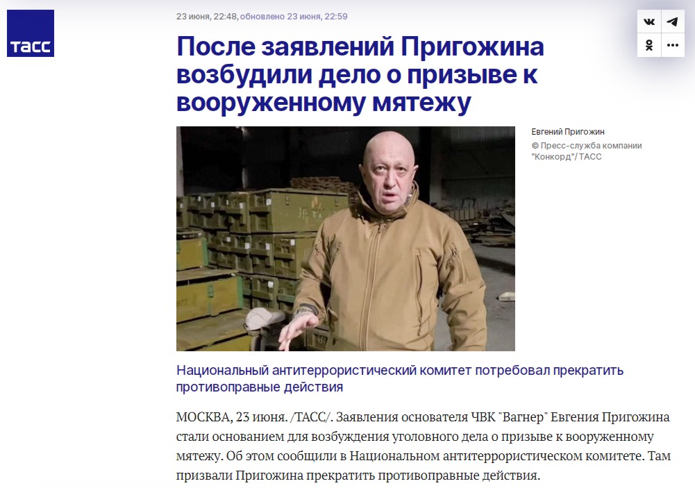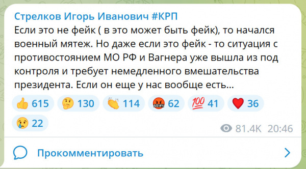 В Z-каналах уже вот это постят. А чего вдруг? Пригожин пока Кремль еще вроде не взял. Может, он вообще завтра объявит, что его взломали, правильно?