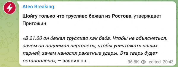 В ТГ Ateo Breaking приводят якобы слова Пригожина о том, что Шойгу бежал, но ссылку не приводят.