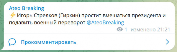 Гиркин-Стрелков пишет о том, что началась попытка военного переворота.
