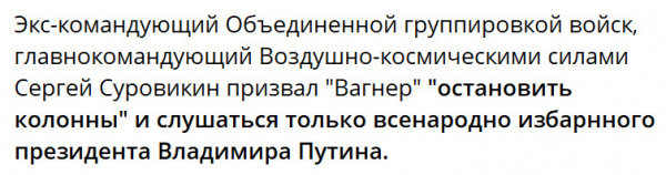 "Командиры ЧВК "Вагнер№ остаются верны самому перспективному политику и будут выполнять любой его приказ. Ни ФСБ, ни Суровикин уже не смогут остановить то что началось. Все генералы, которые с трясущимися руками обращаются к музыкантам с призывами остановиться уже фактически подписали себе приговор. Трибунал обязательно будет. Суровикин еще ответит за сдачу Херсона", - сказано в сообщении.