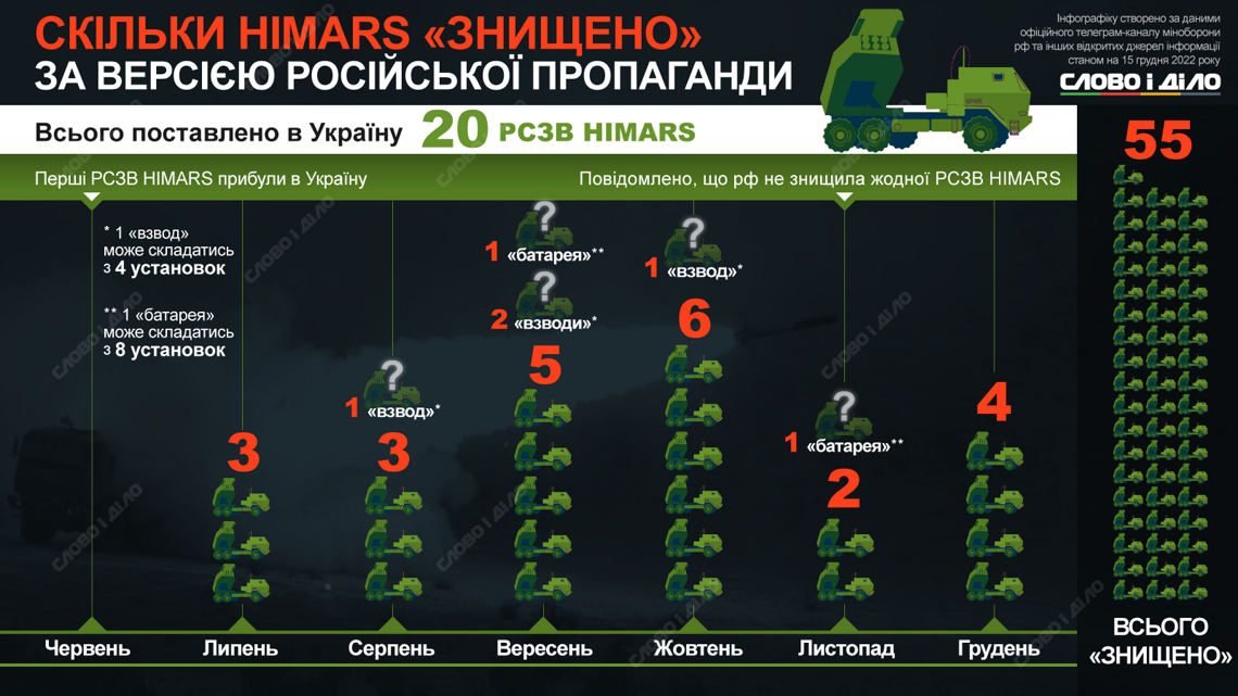 "Министерство обороны отчиталось об уничтожении пяти пусковых установок HIMARS, доведя счет до 32 уничтоженных из 20 поставленных. Одна установка - которая нанесла удар по ПТУ в Макеевке и сразу четыре - в Дружковке."