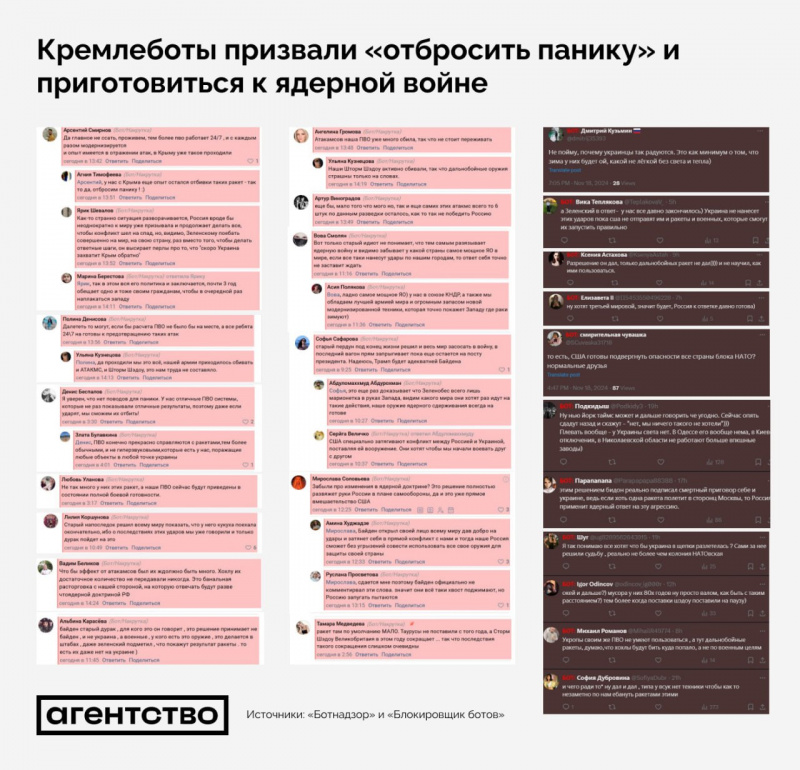 Прикольно, что они еще и ботов запустили с призывами "готовиться к ядерной войне". Теперь Запад точно содрогнется. Уже боты грозят, не только бухой Димон. Вах, баюс, баюс!