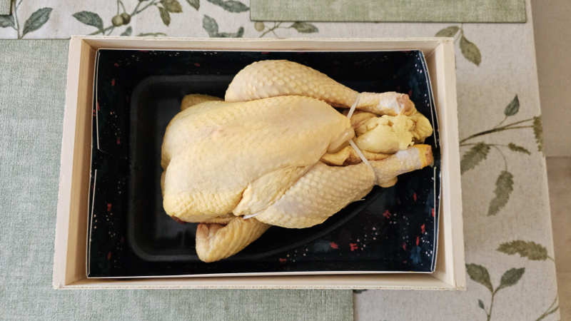 Увесистая такая птичка, под три кило. Сам производитель рекомендует обмазать ее оливковым маслом и запекать 3 часа при температуре 180 градусов, раз в полчаса поливая птичку вытапливаемым жиром.