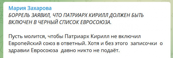 Представил себе Борреля, молящегося о том, чтобы Гундяй не включил Европейский союз в свой чёрный список. Впрочем, мы понимаем, что Евросоюзу и так давно уже кранты, потому что записочки о здравии Евросоюза никто не подает.