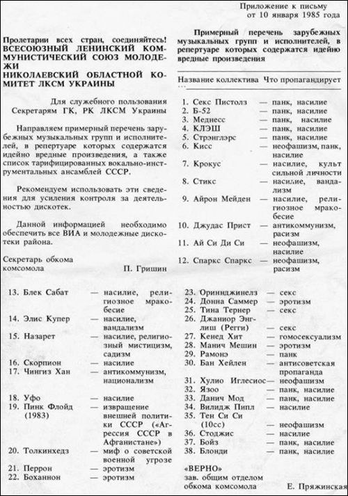 Помню-помню я эту бумажку. Несмотря на ДСП, ее тогда слили, и она в СМИ попала первый раз что-то там году в 1987, насколько я помню. Все тогда еще ржали над тем, как сладкоголосого Хулио Иглесиаса (Иглесиос - это уже что-то греческое получилось) эти пряжинские комсомолки ухитрились в неофашисты записать - вот уж совсем тетки были ку-ку. Ну а "Кисс" в неофашисты, ясный пень, записали за написание названия группы, что очевидно.