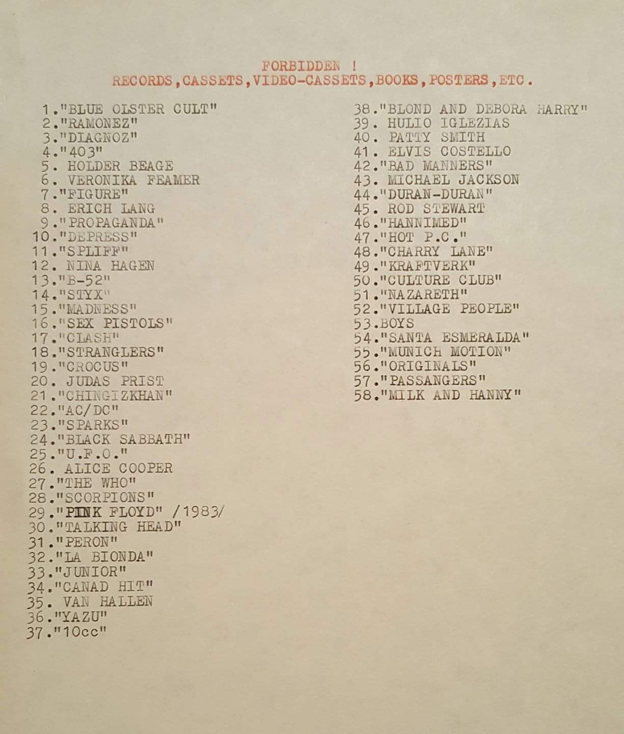 Знаком со списком не понаслышке. Был задержан с пластинками во время рейда комсомольского оперотряда на балке (киевляне знают). Затем на автобусе вместе с другими антисоветскими элементами доставлен в отделение милиции, где и проходил сверку со списком. Так как мои Битлс, Джефф Бек и Алан Холдсуорс в списке отсутствовали, отделался устным выговором. Но многие пострадали посерьёзнее-получили впоследствии телеги на работу и лишились пластинок.
