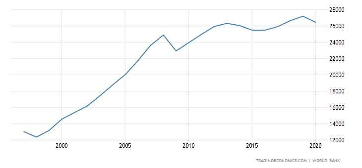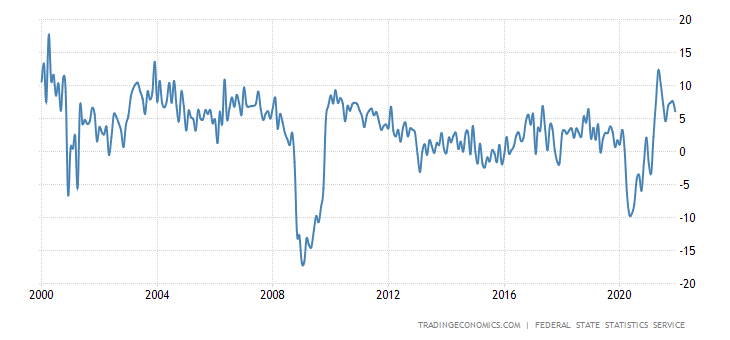 Россия накопила валютный резерв в размере 635 миллиардов долларов, он стал пятым по величине в мире и продолжает расти. Государственный долг страны составляет 18% ВВП, то есть, является шестым по величине в мире и продолжает сокращаться.