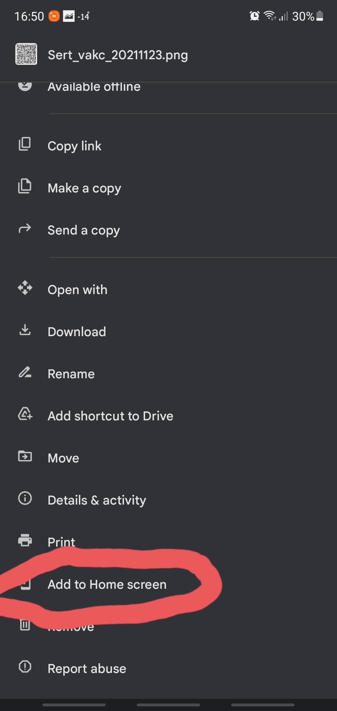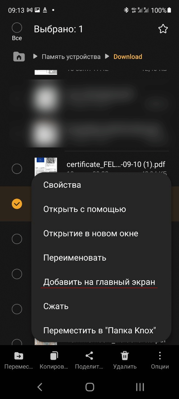 Когда написал предложение выше сообразил, что нельзя продолжить файл на домашний экран. Потом нашёл виджет moon reader, где можно показывать избранное, и добавил свой сертификат в категорию QR в самой программе. После чего она показывается уже в виджете. Одно касание и файл открыт.